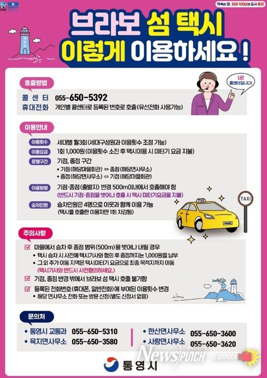 뉴스펀치 박세훈 기자 | 통영시는 도서지역 주민들의 교통 불편 해소와 이동권 보장을 위해 추진 중인'섬 택시'사업을 오는 3월 1일부터 정식 운행한다.