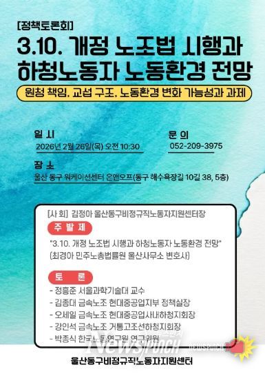 뉴스펀치 김윤걸 기자 | 울산동구비정규직노동자지원센터는 오는 2월 26일 오전 10시 30분, 워케이션센터(해수욕장길 10길 38)에서 ‘3. 10. 개정 노조법 시행과 조선업 하청노동자 노동환경 전망’을 주제로 정책토론회를 개최한다.