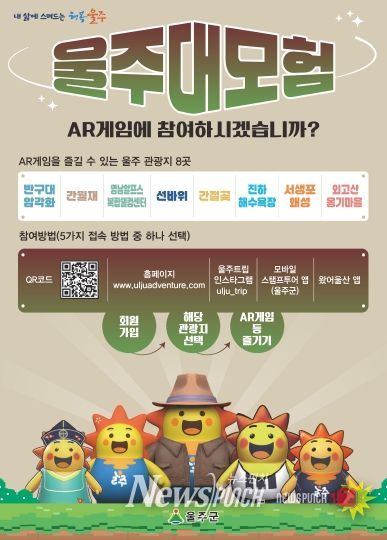 뉴스펀치 김윤걸 기자 | 울산 울주군이 지역 대표 관광지를 무대로 한 AR(증강현실) 게임 ‘울주대모험’과 관광객 참여형 이벤트를 운영한다고 25일 밝혔다.
