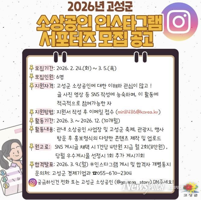 신청은 전자우편으로 지원서류를 제출하며, 모집기간은 3월 4일(목)까지이다. 경력 및 SNS 활동 사항 등을 종합 평가해 총 6명을 최종 선정할 예정이다. 선정된 서포터즈는 소상공인 사업장을 직접 취재하고, 젊은 층이 주로 이용하는 SNS를 통해 고성군의 다양한 매력을 빠르고 정확하게 전달하는 역할을 한다.