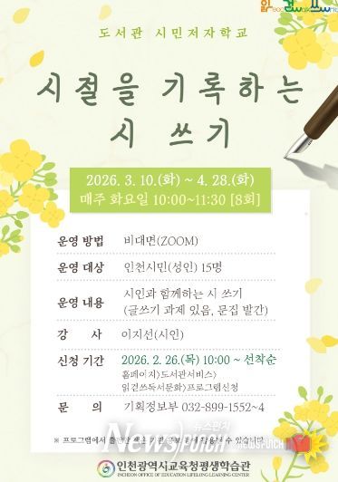 뉴스펀치 정홍균 기자 | 인천광역시교육청평생학습관은 시민의 문학적 감수성을 함양하고 인문학적 소양을 넓히기 위하여, 오는 26일부터 ‘시절을 기록하는 시 쓰기’ 성인 프로그램 수강생을 모집한다.