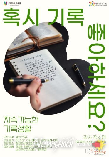 뉴스펀치 정홍균 기자 | 부평구 청천도서관은 오는 3월 21일부터 성인을 대상으로 기록 프로그램 ‘혹시 기록 좋아하세요?’를 운영한다.