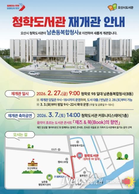 강래출 오산시 중앙도서관장은 “신청사 이전을 통해 청학도서관이 보다 쾌적하고 접근성 높은 복합문화공간으로 거듭났다”며 “시민 누구나 편안하게 머물며 책과 문화를 함께 즐길 수 있는 지역 대표 도서관으로 자리매김하길 기대한다”고 말했다.