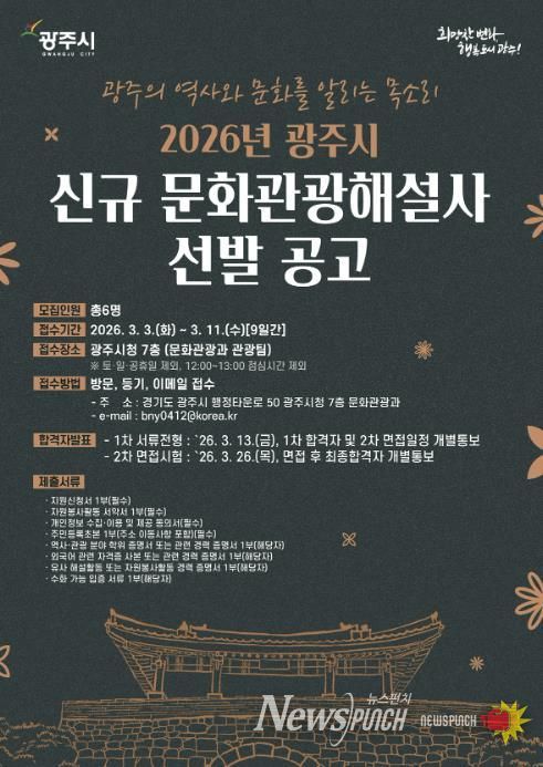뉴스펀치 박상훈 기자 | 광주시는 2026년도 광주시 문화관광 해설사 신규 선발을 위해 오는 3월 3일부터 11일까지 원서 접수를 실시한다고 25일 밝혔다.