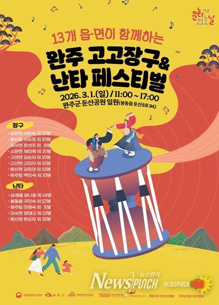 뉴스펀치 정홍균 기자 | 완주문화재단은 오는 3월 1일 완주군 둔산공원 일원에서 13개 읍·면이 2026 완주 고고장구·난타 페스티벌을 개최한다.