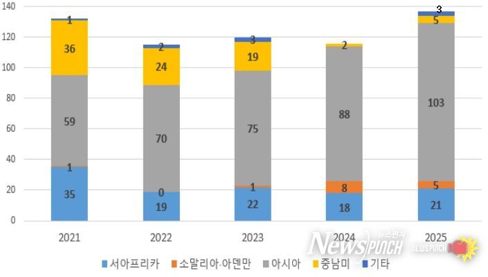 뉴스펀치 정홍균 기자 | 해양수산부는 2월 25일 ‘2025년 전 세계 해적사건 발생 동향’을 발표했다. 2025년 전 세계 해적사건은 2024년보다 증가(116→137건)했으나 승선자 피해는 감소(151→88명)했으며, 우리 국민과 선박에 대한 피해는 발생하지 않았다.