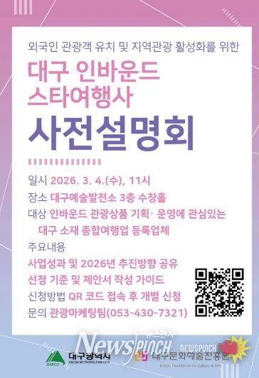 뉴스펀치 조평훈 기자 | 대구광역시와 대구문화예술진흥원 관광본부는 오는 3월 4일 오전 11시 대구예술발전소 수창홀에서 대구 소재 종합여행업 등록업체를 대상으로 ‘2026년 대구 인바운드 스타여행사 육성사업’ 사전 설명회를 개최한다.
