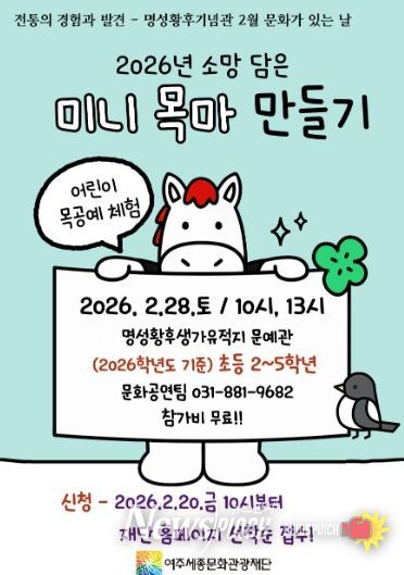 뉴스펀치 박상훈 기자 | 여주세종문화관광재단은 오는 2월 28일, 명성황후기념관 2월 문화가 있는 날 프로그램으로 '2026년 병오년 소망을 담은 미니 목마 만들기'를 진행한다.