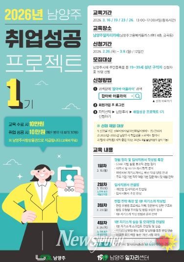 뉴스펀치 박상훈 기자 | 남양주시는 오는 26일부터 청년 구직자의 취업 경잭력 강화를 위해 ‘2026 취업성공 프로젝트 1기’참여자를 모집한다고 밝혔다.