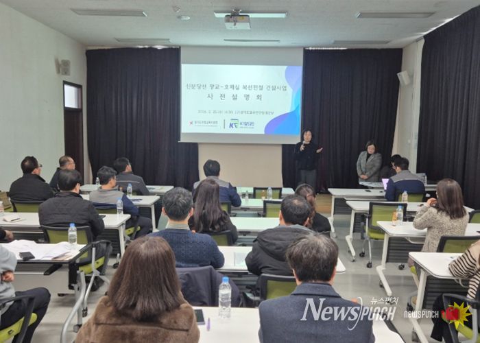 뉴스펀치 박상훈 기자 | 경기도수원교육지원청은 신분당선 광교–호매실 복선전철 공사 추진에 앞서 2월 25일 국가철도공단과 함께 공사 구간 100m 이내에 위치한 5개 인접학교를 대상으로 사전설명회를 실시했다고 밝혔다.