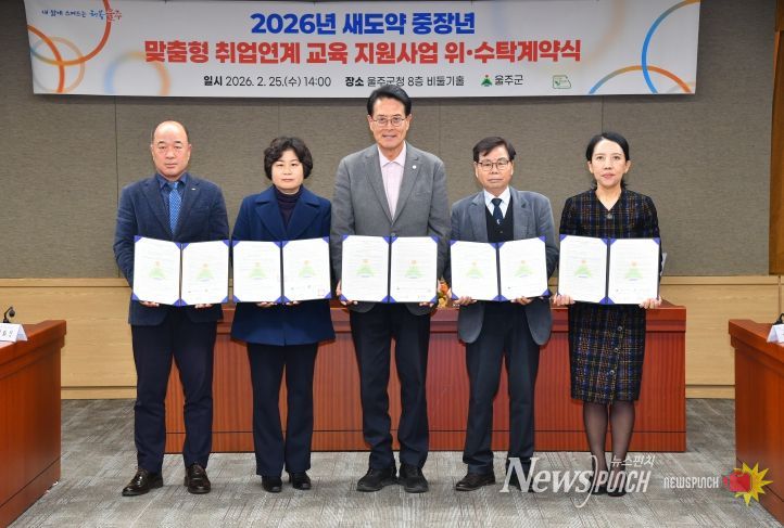 뉴스펀치 김윤걸 기자 | 울산 울주군이 25일 군청 비둘기홀에서 이순걸 군수와 4개 수행기관 대표 등이 참석한 가운데 ‘새도약 중장년 맞춤형 취업연계 교육 지원사업’ 업무계약을 체결했다.