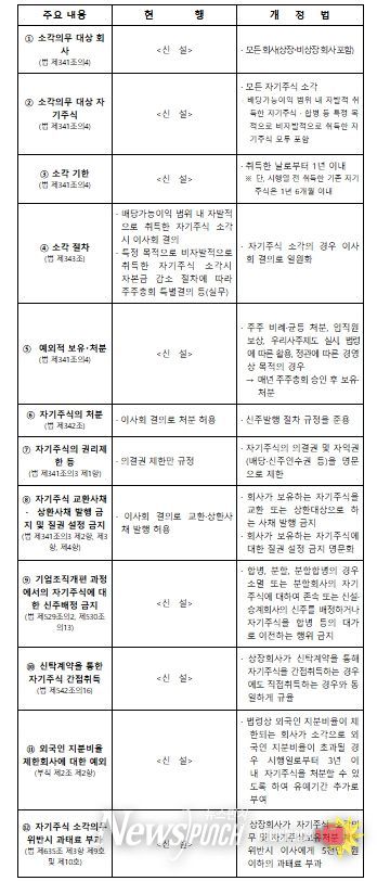 또한, 개정안은 모든 자기주식의 소각을 ‘이사회 결의’로 하도록 하여 소각 절차를 간소화했고, 법령상 외국인 지분비율이 제한되는 회사가 소각으로 외국인 지분비율이 초과될 경우 시행일로부터 3년 이내 자기주식을 처분할 수 있도록 하여 유예기간을 추가로 부여했다.