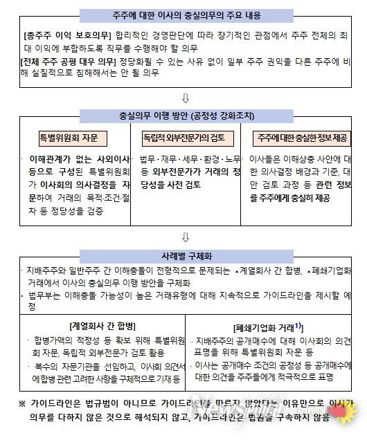 충실의무 이행방안에는 첫째, 이해관계가 없는 사외이사 등으로 구성된 ‘특별위원회’가 이사회 의사결정을 자문하는 방안, 둘째, 법무·재무·세무·환경 등 외부전문가가 거래의 정당성을 사전 검토하는 방안, 셋째, 이해상충 사안에 대한 이사의 의사결정 배경과 기준 등 관련 정보를 주주에게 충실히 제공하는 방안 등이 포함된다.