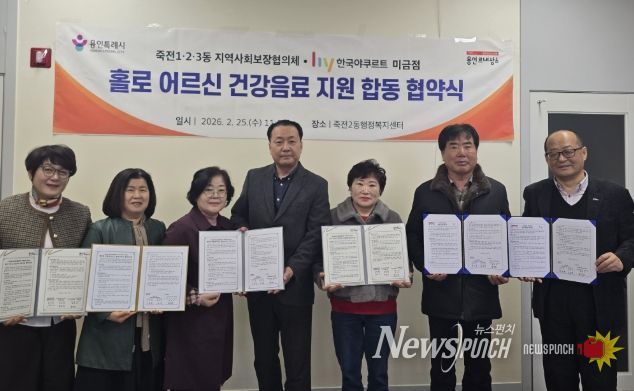 뉴스펀치 박상훈 기자 | 용인특례시 수지구 죽전1·2·3동 지역사회보장협의체는 25일 죽전2동 행정복지센터에서 ㈜hy 미금점과 ‘홀로어르신 건강음료 지원’ 사업 협약을 체결했다고 26일 밝혔다.