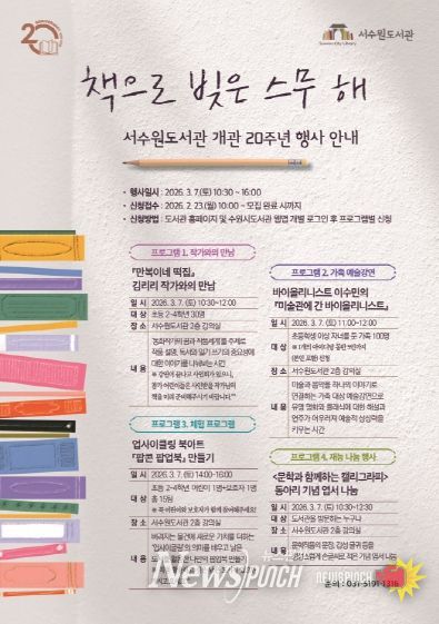 뉴스펀치 박상훈 기자 | 수원시 서수원도서관이 개관 20주년을 맞아 3월 7일 오전 10시 30분부터 기념행사 ‘책으로 빚은 스무 해’를 개최한다.