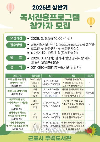 뉴스펀치 박상훈 기자 | 군포시 부곡도서관은 지역 주민들에게 올바른 독서 환경을 제공하고 책 읽는 즐거움을 선사하기 위해 ‘2026년 상반기 독서진흥프로그램’을 운영한다고 밝혔다.