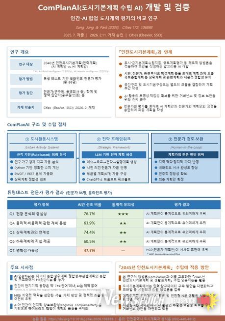 해당 방법론은 국제적으로도 이미 검증을 마쳤다. 2040년 인천도시기본계획 변경 수립 경험을 바탕으로 인공지능과 인간의 계획 특성을 비교·분석한 연구 '컴플랜에이아이를 활용한 도시계획(Planning with ComPlanAI)'은 2026년 2월 21일 사회과학인용색인(SSCI) 등재 도시계획 분야 최상위 국제학술지인 Cities(시티즈)에 게재됐다.