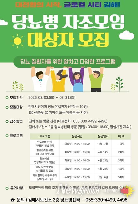 뉴스펀치 박세훈 기자 | 김해시보건소는 3월 3일부터 31일까지 당뇨병 환자 자가관리 역량 강화를 위한 ‘당뇨병 자조모임’ 참가자를 모집한다.