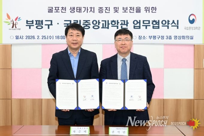 뉴스펀치 정홍균 기자 | 부평구는 25일 오후 4시 구청 영상회의실에서 국립중앙과학관과 ‘굴포천 생태가치 증진 및 보전을 위한 업무협약’을 체결했다.