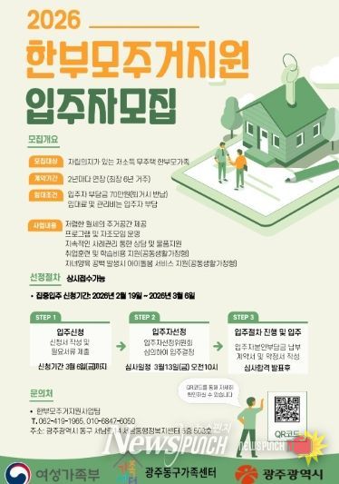 뉴스펀치 최영남 기자 | 광주광역시는 자립 의지가 있는 저소득 무주택 한부모가족의 주거 안정을 돕기 위해 ‘한부모 주거 지원사업’ 입주자 46가구를 모집한다.