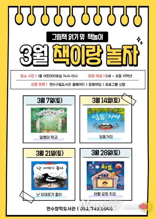 이번 프로그램은 전문 독서강사가 5세부터 초등 저학년 어린이를 대상으로 매주 토요일(1~4주) ▲연수청학도서관 2시, ▲해돋이도서관 11시에 운영하며, 책을 읽어주고 다양한 책 놀이를 진행한다.
