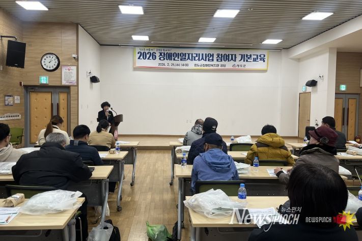 뉴스펀치 박세훈 기자 | 청도군에서는 지난 25일부터 26까지 이틀간 청도군장애인복지관, 운문면사무소에서 장애인일자리사업 참여자 56명을 대상으로 2026년 장애인일자리사업 참여자 기본교육을 실시했다.