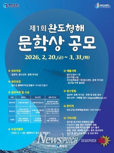 뉴스펀치 최영남 기자 | ‘치유의 섬’ 완도군에서는 많은 사람들이 문학의 향기로 마음을 치유할 수 있도록 ‘제1회 완도 청해 문학상’ 공모전을 연다.