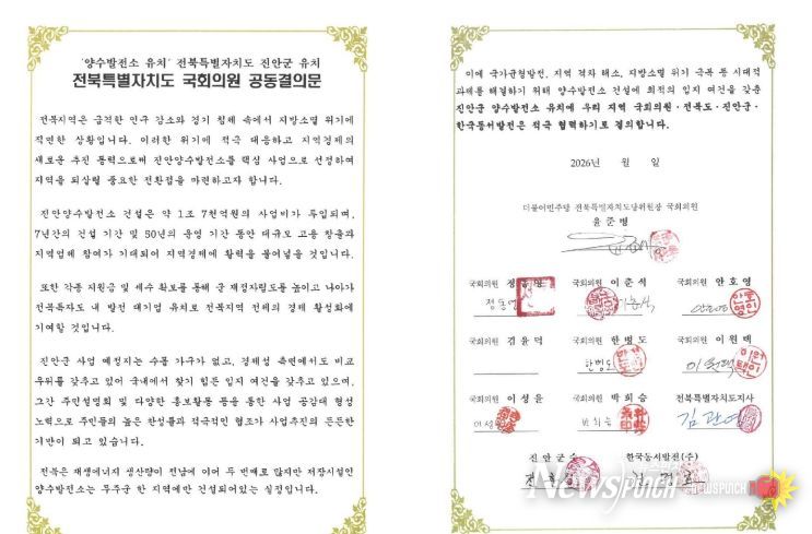 진안군 관계자는 “양수발전소 유치는 진안군을 넘어 전북 전체의 미래 경쟁력과 직결된 과제”라며 “전북특별자치도와 지역 국회의원들이 함께 뜻을 모아 공동서명으로 이어졌다는 것은 전북이 하나의 팀으로 움직이고 있다는 상징적인 의미를 갖는다”고 밝혔다.