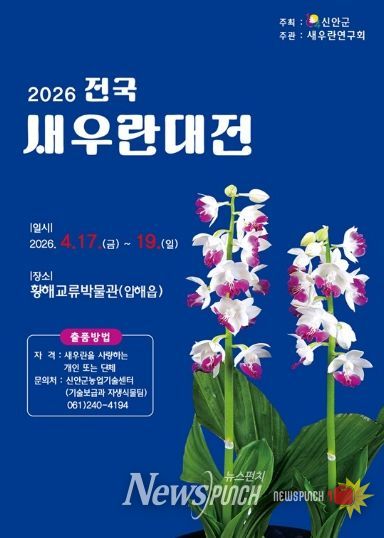 뉴스펀치 최영남 기자 | 신안군은 국내 최대 규모의 새우난초 전시·경연 행사인 ‘2026 전국새우란대전’을 4월에 개최하며, 전국의 새우난초 재배 농가, 애호가, 단체를 대상으로 출품 참가자를 모집한다.