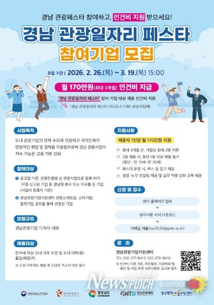 뉴스펀치 박세훈 기자 | 경상남도는 경남관광재단 관광기업지원센터 주관으로 도내 관광기업의 인력 수요에 대응하고 지역인재 취업을 지원하기 위해 ‘2026 경남 관광일자리 페스타’ 참여기업을 모집한다고 밝혔다.
