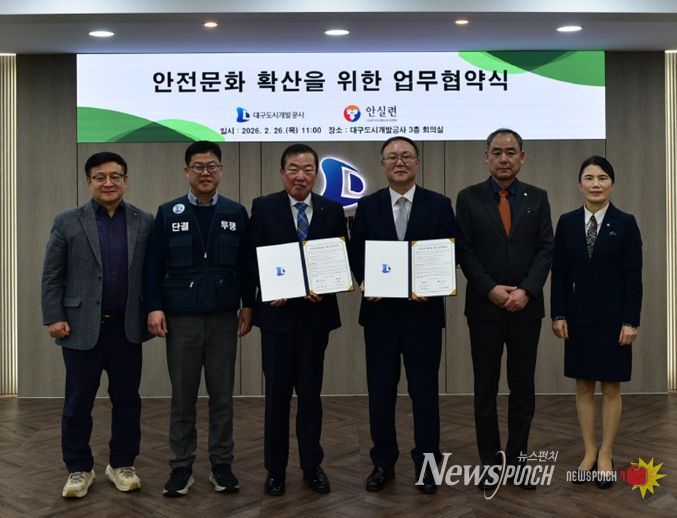 뉴스펀치 조평훈 기자 | 대구도시개발공사는 2월 26일 본사 회의실에서 (사)대구안전생활실천시민연합과 ‘안전문화 확산을 위한 업무협약’을 체결했다.