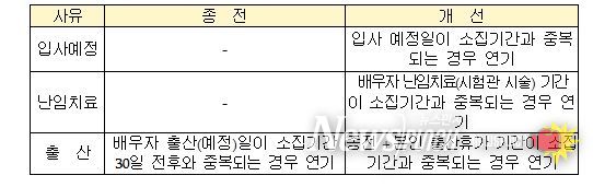 특히, 올해에는 청년층의 취업활동 보장과 출산ㆍ육아의 안정적 지원을 위해 ‘입사 예정’,‘배우자 난임치료’및‘본인 출산휴가’사유 연기기준을 신설했다. 이번 연기제도 개선으로 청년층의 일상과 병역이 조화를 이루는데 도움이 될 것으로 기대하고 있다.