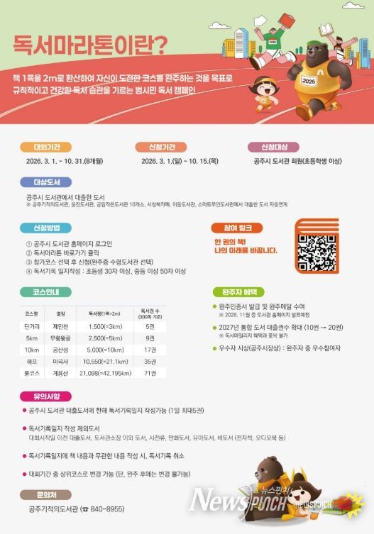 박찬옥 평생학습과장은 “독서마라톤은 긴 호흡으로 책과 가까워지며 성취감을 느낄 수 있는 특별한 여정”이라며 “공주의 아름다운 명소를 여행하는 마음으로 많은 시민이 참여해 책을 통해 일상을 더욱 풍요롭게 가꾸길 바란다”고 말했다.