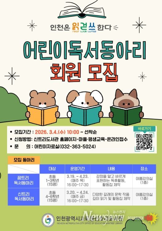 뉴스펀치 정홍균 기자 | 인천광역시교육청신트리도서관은 오는 3월 4일부터 ‘어린이 독서동아리’참여자를 모집한다.