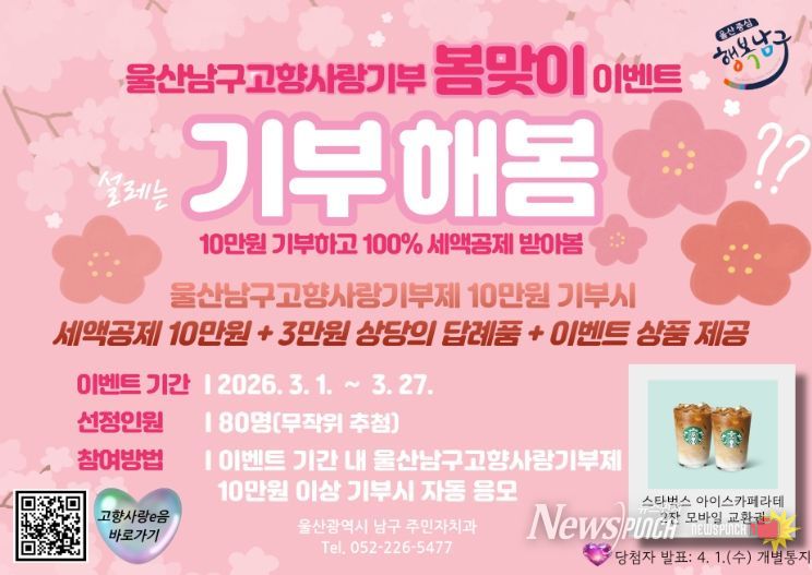 뉴스펀치 김윤걸 기자 | 울산 남구가 봄을 맞아 고향사랑기부제 참여 활성화를 위해기부자 참여이벤트를 진행한다.