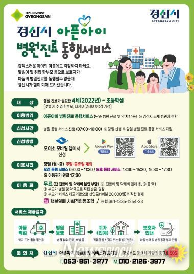 뉴스펀치 박세훈 기자 | 경산시는 맞벌이 가정과 양육 공백 가정의 돌봄 부담을 덜기 위해 ‘아픈 아이 병원 동행 서비스’를 3월부터 본격 운영한다고 밝혔다.