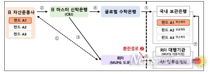 24일 일본 현지의 한 자산운용사는 기존처럼 마스터 신탁은행*(CBJ**)과 글로벌 수탁은행을 통해 결제 정보를 전달하면서도, 원화는 일본 현지의 RFI(MUFG)를 통해 별도로 환전하여, 국내 보관은행에 환전대금을 직접 송금하는 형태의 제3자 환전 시범거래에 성공했다.