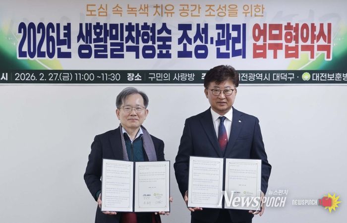 대덕구는 27일 구청 구민의사랑방에서 대전보훈병원과 ‘2026년 생활밀착형 숲(옥상정원) 조성사업’을 위한 업무협약을 체결했다고 밝혔다.