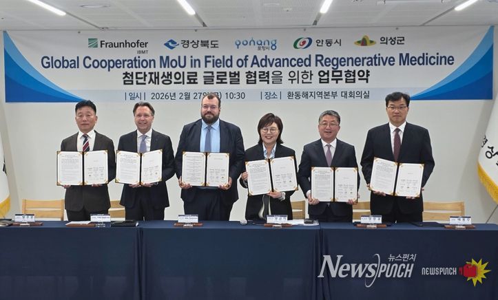 뉴스펀치 박세훈 기자 | 안동시는 경상북도, 포항시, 의성군과 함께 2월 27일 환동해지역본부(동부청사) 9층 대회의실에서 독일 프라운호퍼 IBMT 연구소와 ‘첨단재생의료산업 육성을 위한 업무협약 (MOU)’을 체결했다.