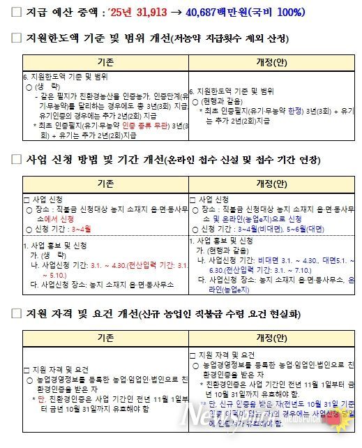 그동안 친환경직불금 지급횟수 산정 시 저농약인증(’16년 폐지) 지급 이력이 포함되어 일부 농가의 직불 참여 기회가 제한되고 신규 인증농가의 직불금 신청 요건이 현실에 맞지 않다는 등의 현장 의견이 제기되어 왔다.