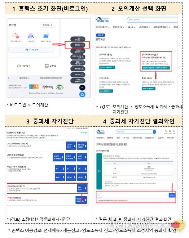 홈택스(PC)와 손택스(모바일)에서는 납세자가 간단한 질문·답변을 통해 다주택자 중과 여부를 진단해볼 수 있는 「양도소득세 중과 자가진단」 서비스를 제공하고 있으며, 납세자가 중과 여부에 따른 양도소득세 예상세액을 미리 계산해볼 수 있는 「양도소득세 모의계산」 서비스도 제공하고 있다.