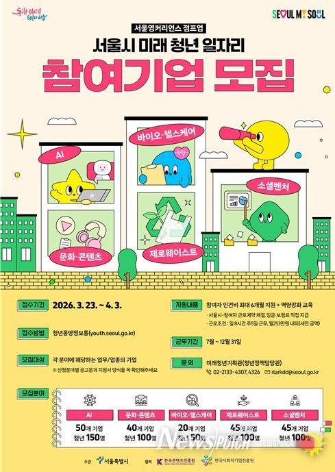 뉴스펀치 박상훈 기자 | 서울시는 2026년 청년 고용시장 변화에 맞춰 미래 청년 일자리 사업을 5대 신산업 분야로 확대하고 AI, 문화·콘텐츠, 바이오·헬스케어, 제로웨이스트, 소셜벤처 분야 혁신기업 200곳을 공개 모집한다고 밝혔다.