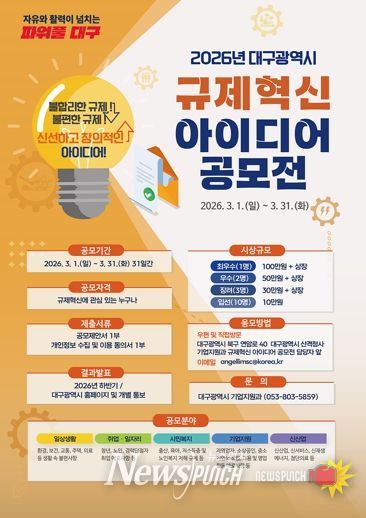 뉴스펀치 조평훈 기자 | 대구광역시는 시민과 기업이 일상에서 겪는 불합리한 규제를 개선하고, 민생 안정과 지역경제 활력 제고를 위해 ‘2026년 대구광역시 규제혁신 아이디어 공모전’을 개최한다.