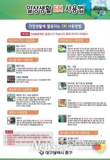 뉴스펀치 조평훈 기자 | 대구 중구는 환경보호 실천과 주민들의 친환경 생활습관 함양을 위해 3월부터 11월까지 ‘EM(유용미생물) 배양액 무상 공급 사업’을 추진한다.