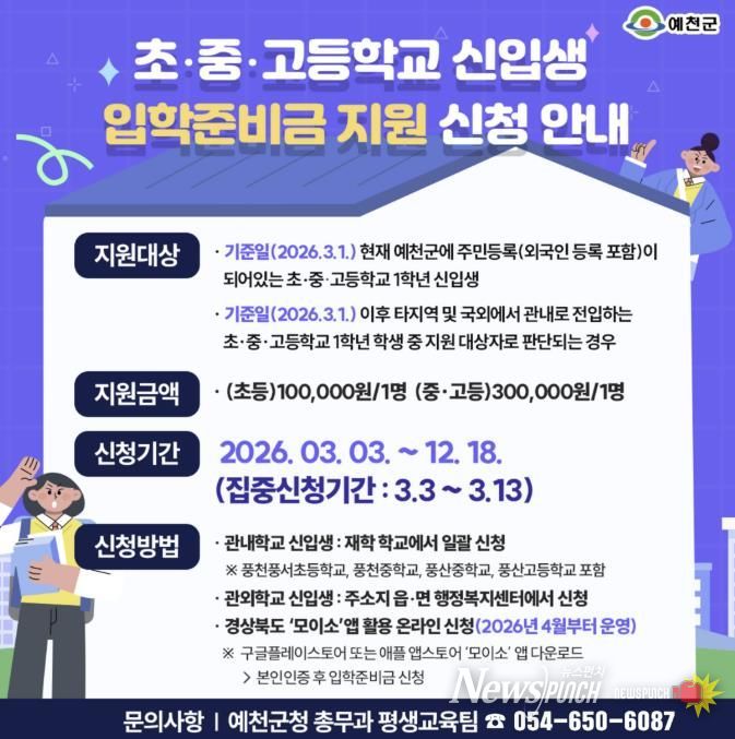 뉴스펀치 박세훈 기자 | 예천군은 3일부터 2026학년도 초·중·고등학교 신입생을 대상으로 입학준비금을 지원한다고 밝혔다.