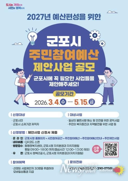 뉴스펀치 박상훈 기자 | 군포시는 3월 4일부터 5월 15일까지 ‘2027년 예산편성을 위한 주민참여예산 제안사업’을 공모한다.
