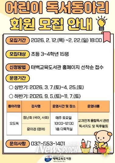 뉴스펀치 조평훈 기자 | 태백교육도서관은 초등학생의 교과 학습 역량을 강화하고 사고력을 증진하기 위해 어린이 독서동아리 ‘오도독’을 운영한다.