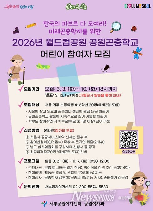 뉴스펀치 박상훈 기자 | 서울시 서부공원여가센터는 곤충학자 정부희 박사와 함께 봄·여름·가을철 다양한 곤충을 관찰하고 자연 속에서 곤충의 역할을 학습하는 월드컵공원 생태 프로그램인 ‘공원곤충학교’에 참여할 어린이 20명을 모집한다.