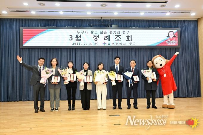 뉴스펀치 김윤걸 기자 | 울산 중구가 3월 3일 오전 9시 중구청 대회의실에서 3월 정례조회를 열고 지방세 성실·모범 납세자에게 표창을 수여했다.