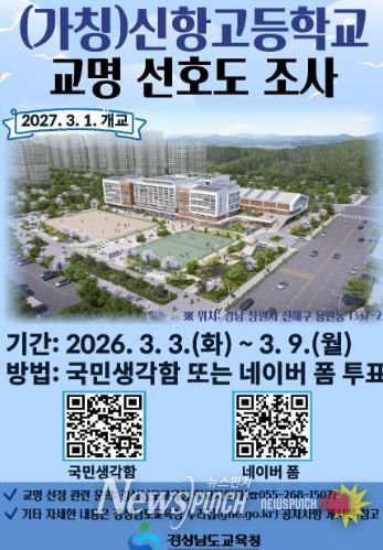 뉴스펀치 박세훈 기자 | 경상남도교육청은 2027년 3월 문을 여는 신설 학교 3곳의 이름을 정하기 위해 오는 3일부터 9일까지 도민 선호도 조사를 진행한다.